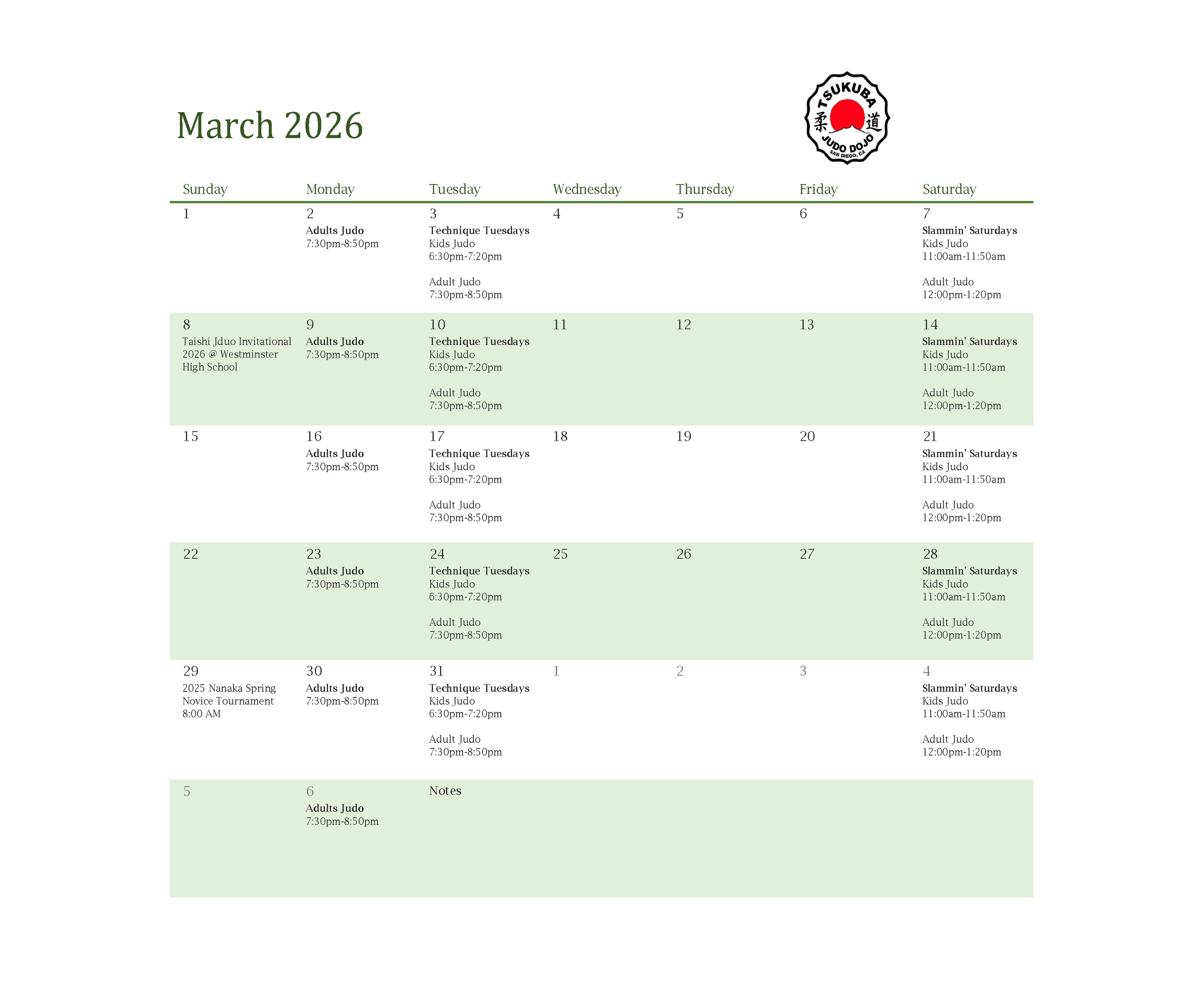 Schedule Upcoming Events 3/8/26 - Taishi Judo Club 15th Anniversary Invitational - Westminster High School 3/29/26 - Nanka 2026 Spring Development Tournament- Westminster High School 5/22/26-5/24/26 - Golden State Open 2026 - Los Angeles Convention Center 7/19/26 - California State Games 9/27/26 - Nanka Fall Tournament - Westminster High School 11/1/26 - Nanka Team Tournament - Westminster High School 12/4/26-12/6/26 - Nanka Winter Nationals - TBD